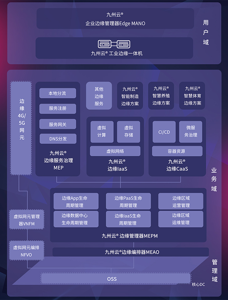 依托以上开放的技术体系,九州云打造出了符合3GPP和ETSI规范的边缘全栈解决方案,包括边缘编排器MEAO、边缘管理器MEPM、边缘Iaas、边缘CAAS、边缘服务治理MEP、企业级边缘管理器MANO,打造开放生态的边缘云平台,覆盖开发,程序构建,沙箱测试、全局分发、边缘分流、服务治理和应用升级等关键生命流程,助力农业、工业、能源、教育、体育和交通等领域。