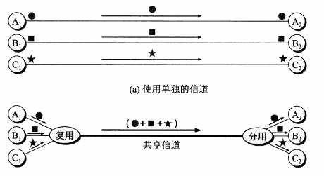 复用技术就是在发送端使用一个复用器,让大家合起来使用一个共享信道进行通信。在接收端再使用分用器,把合起来传输的信息分别送到相应的终点。