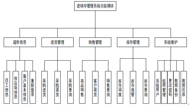 超市管理系统主要由基本信息管理、进货管理、销售管理、库存管理、系统维护等模块组成,具体规划如下: