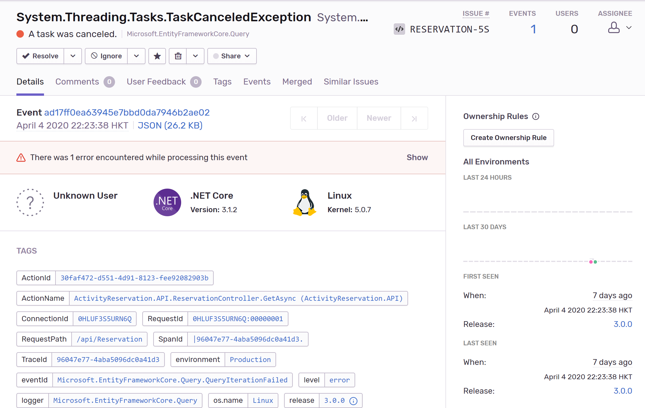 修改 sentry event 信息,对于发生的错误异常可以在发送到 sentry 服务器端之前做修改,对于要忽略的异常也可以在这个事件中做,比如系统中的 taskcanceledexception ,我在使用异步查询方法的时候会传递一个 cancellationtoken ,客户端中断了请求就会导致这个 token 的 cancel 事件被触发,ef 就会报一个 taskcanceledexception 前段时间,sentry 经常会给我发一些异常邮件,全都是 taskcanceledexception,我们可以在这个事件里判断如果异常时 taskcanceledexception 就返回一个 null, 这样这个异常就不会被提交到 sentry 服务器端了