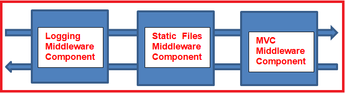 上面的图片中,我们看到有了一个日志记录的中间件组件。这个组件是简单的记录请求的时间,并且将其传递给下一个中间件组件。也就是静态文件中间件组件,来做进一步的处理。