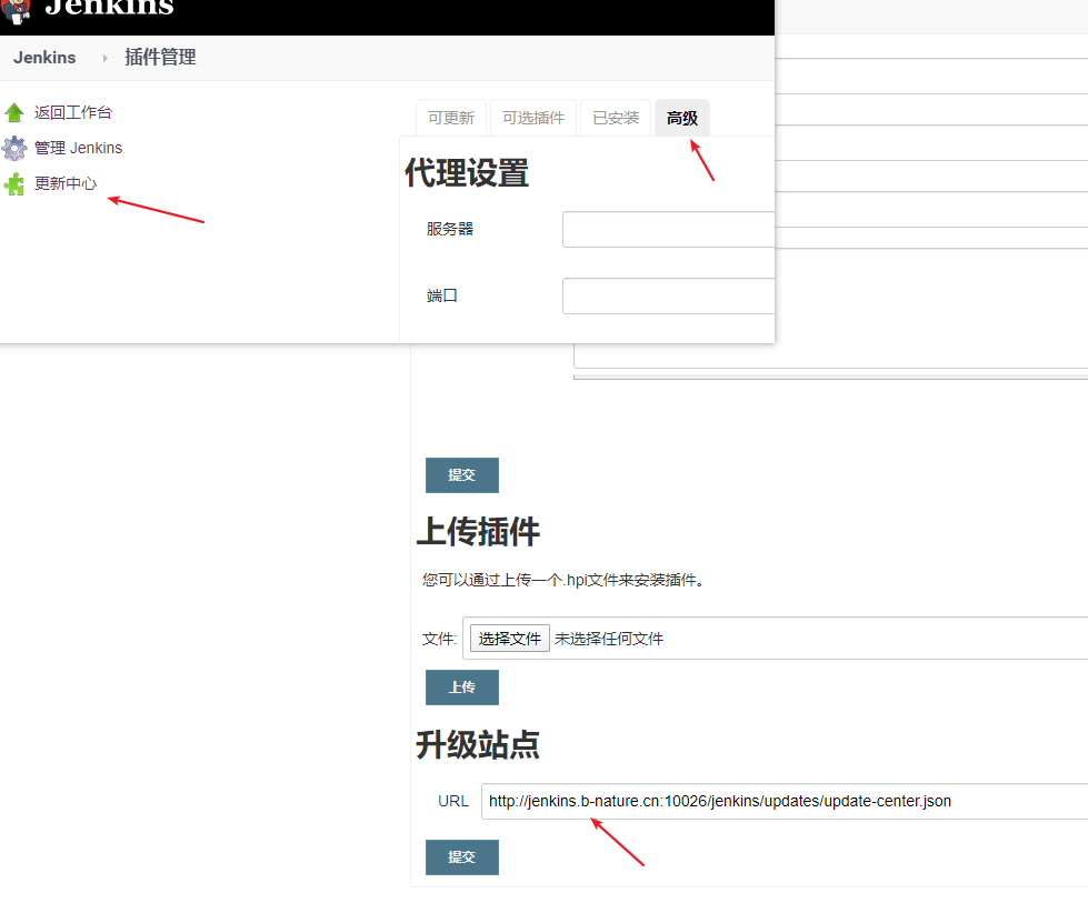 jenkins也提供插件本地安装的能力,也在“更新中心"->"高级"面板,操作简单,此处不在赘述。