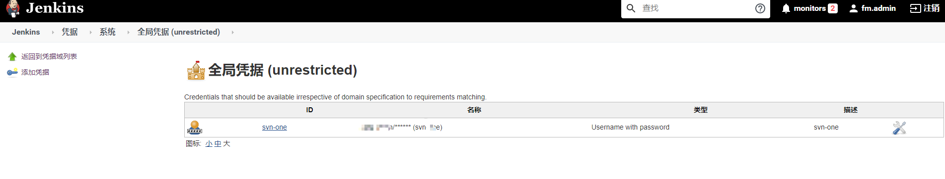 - 全局凭据:jenkins对svn, git等有一个全局凭据中心来管理账号,这类账号可以在此中心管理,配置结果如下图: