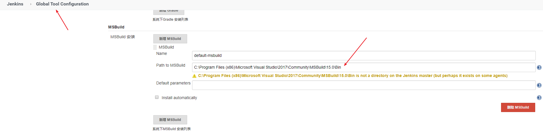- 其中配置的msbuild路径应该是.net编译环境所在位置,如果是在slave机器上,要配置slave机器上的路径