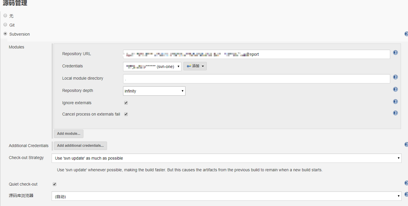此处注意凭据的选择,应该是对应得上,以及svn的地址要填写正确