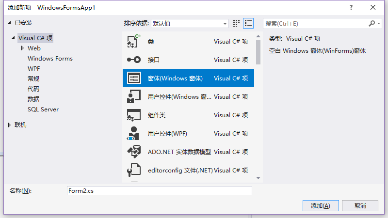 新建form2:右击》》添加》》新建项》》窗体