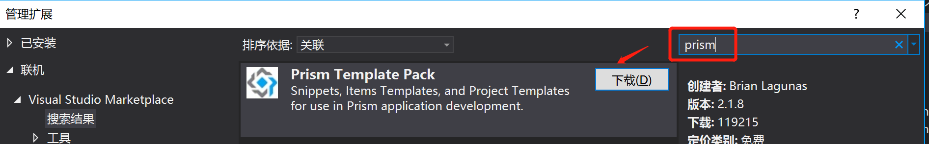 下载上图搜索到的prism模板,重启vs,它会自动安装,新建项目时,就有prism模块模板选择了: