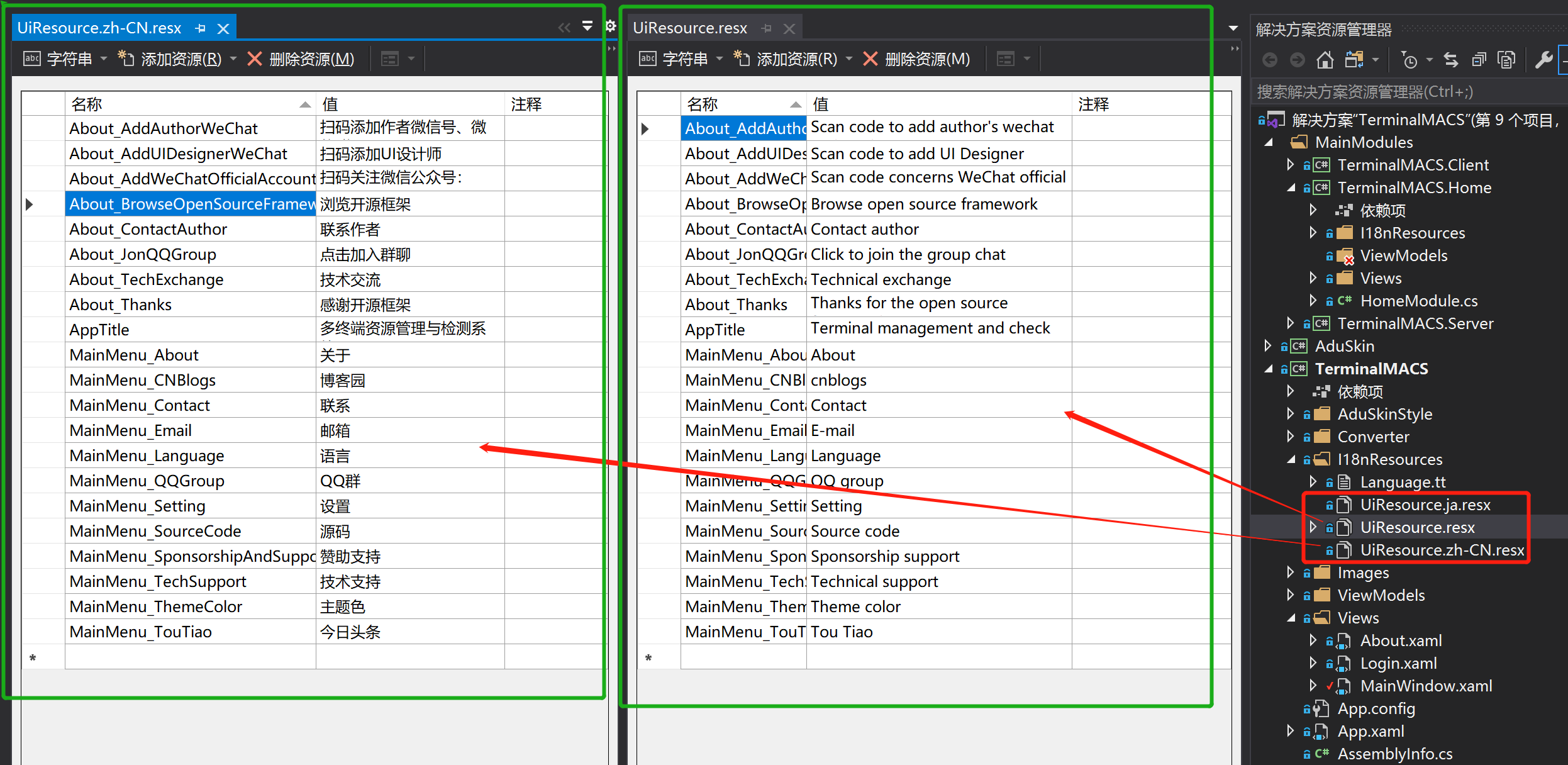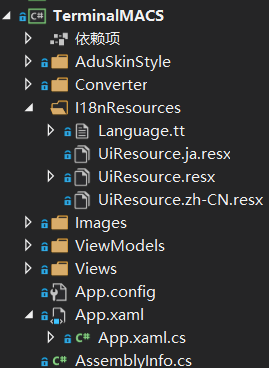 删除了原有的xaml语言文件,替换为resx的资源文件,和三个模块的资源文件类型类似,下面是主工程的资源文件: