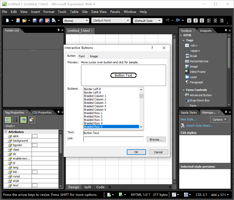 这就是它的主界面,除了常用的web设计功能,有两个功能我印象深刻,其中一个就是上图的interactive buttons,可以创建多个样式的按钮,并提供了这些按钮的图片。在当年我常常把这些图片拿去silverlight上用。后来我写xaml越来越熟练,反而越来越觉得系统中的按钮应该越简洁越好,就再也不使用这种图片按钮了。