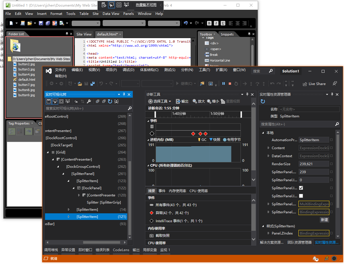 上面是正在被visual stuido 2019调试的expression web。在当时expression studio是微软发布的最漂亮的wpf软件,连右键菜单都经过精心设计,即使现在看来都很时髦(设计潮流又轮回了一次,最近微软又重新喜欢上了下面这种圆角设计):