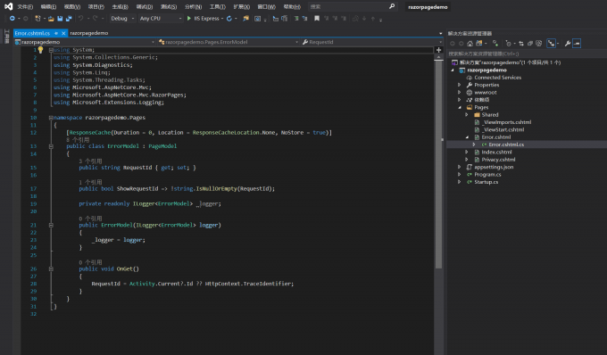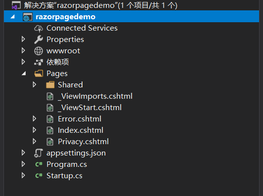 新建项目的目录结构比mvc项目简单。它没有controllers目录,pages有点像mvc项目的views目录,里面存放了cshtml模板。随便点开一个cshtml文件,发现它都包含了一个cs文件。这是跟mvc项目最大的不同,这个结构让人回忆起那古老的webform技术,o(╥﹏╥)o 。