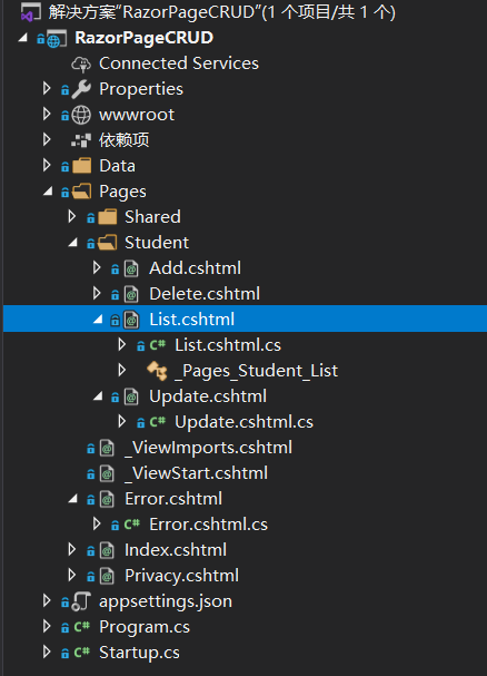在pages目录下面新建student目录。在student目录下新建4个razor page名叫:list、add、update、delete。