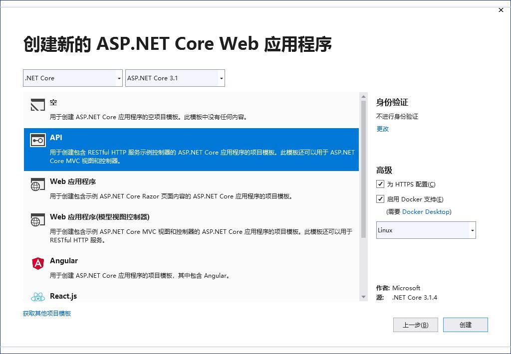 二、新建一个.netcore3.1的api项目,在创建的时候选中启用docker支持。