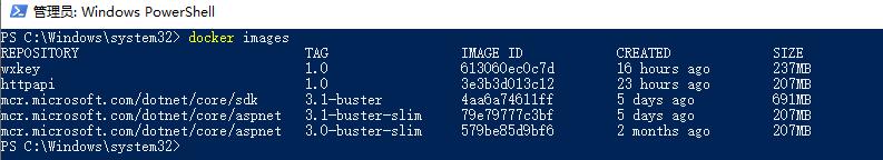 五、打包完成后运行power shell(管理员模式),然后运行 docker images即可看到docker包已经推送到docker desktop中了
