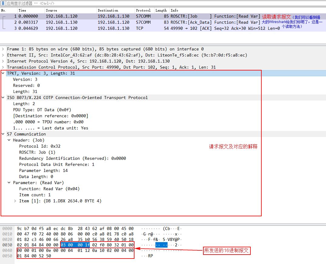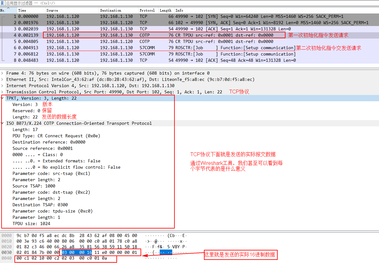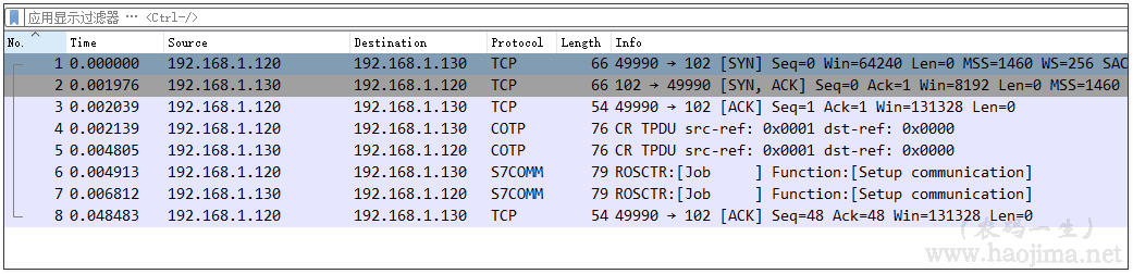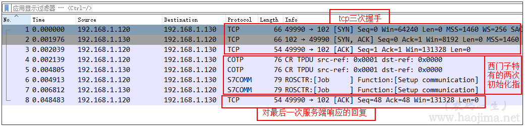 我们看到上面连接西门子plc抓取到了八条报文。其中有tcp的三次握手、和对最后一次响应的回复,然后就是西门子特有的两次初始化指令的请求和响应。