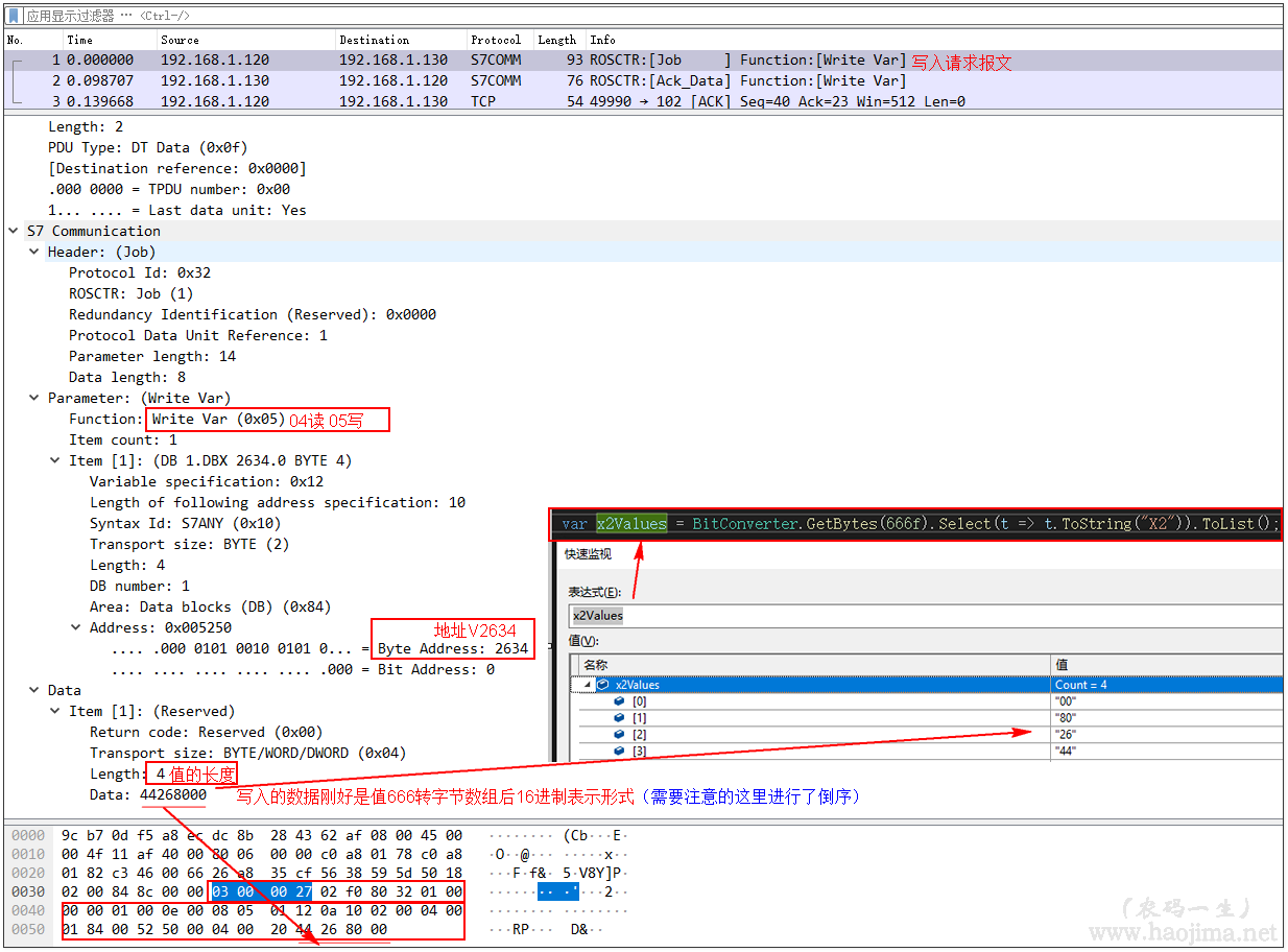 我们在客户端电用iotclienttool对地址v2634写入值666,抓取到包