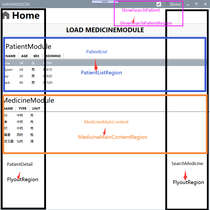 - flyoutregion:注入了patientdetail和searchmedicine视图