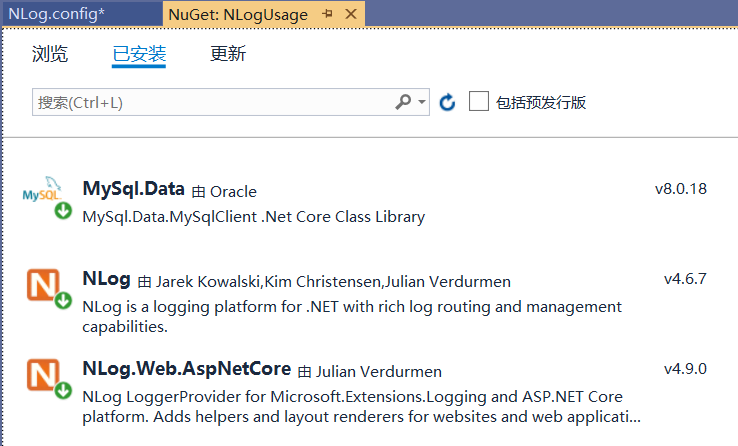 在nuget中安装nlog和nlog.web.aspnetcore ,这两个是nlog相关的包。