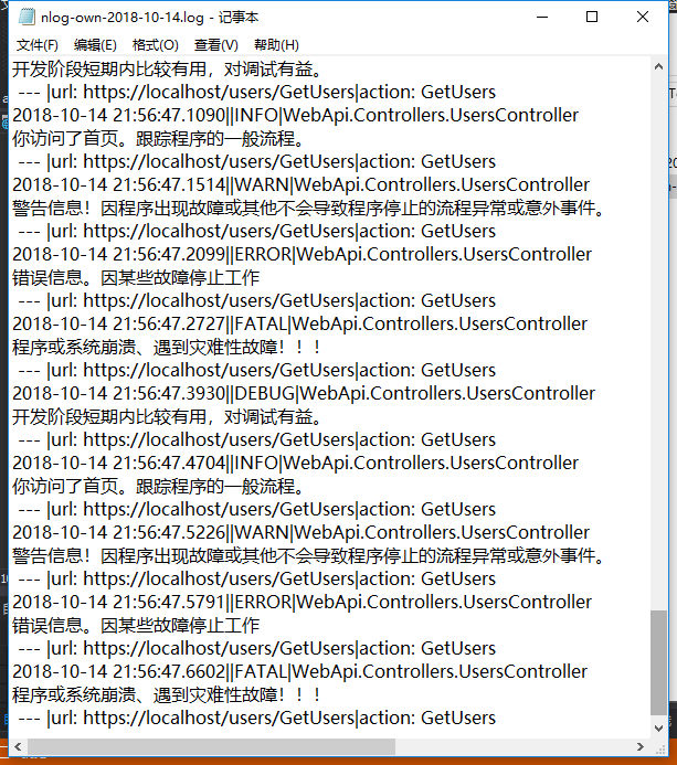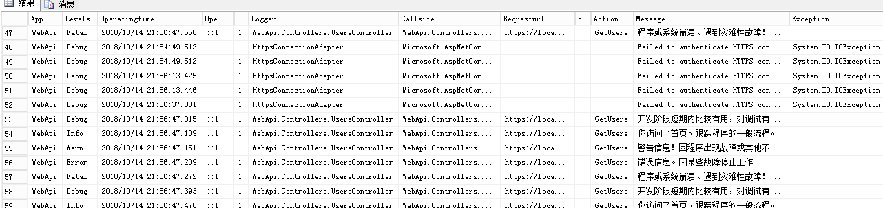 所有工作完成,运行程序。在配置NLog路径下生成日志文件,同时,在数据库中生成日志。