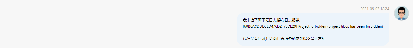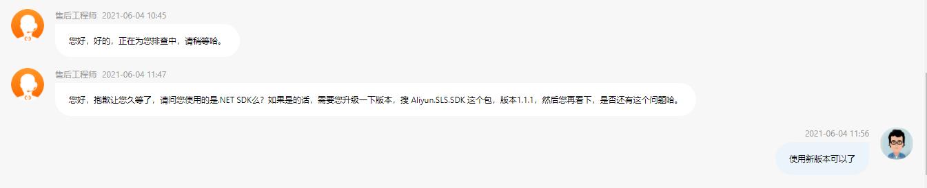中间个有小插曲,由于公司使用阿里云日志比较早,也非常稳定,替换成我申请的阿里云日志的配置,发送日志一直报错,找了半天没找到原因,提了工单,原来阿里云使用了新的SDK