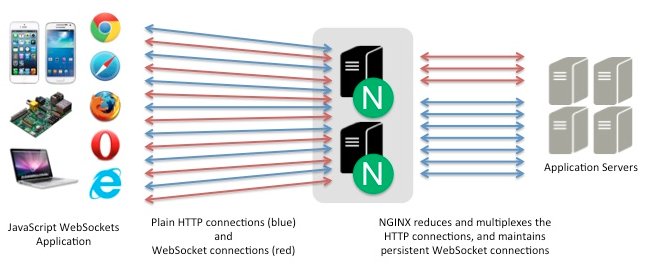 WebSocket协议具有强大的JavaScript接口,因此非常适合作为应用服务器的Node.js——而且,对于事务量不多的web应用程序,也可以作为web服务器。当事务量增加,那么在客户端和Node.js web服务器之间,多个应用服务器之间使用NGINX或NGINX Plus插入NGINX就有必要了。