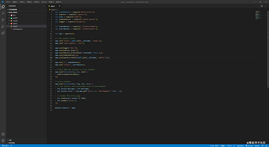 监听bin/www文件,默认端口为3000,可在www文件中更改, 打开浏览器,输入localhost:3000