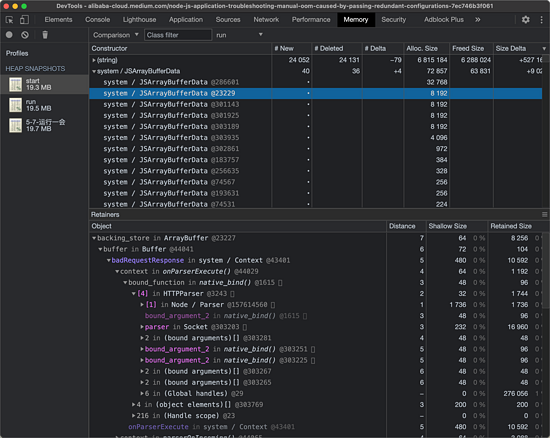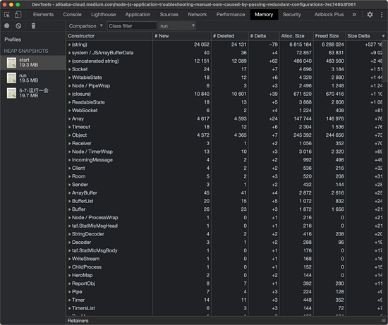 因为是内存原因导致的,而且有逐步持续上升的现象,所以就联想到了内存泄漏这个方向,常用的做法是打印「堆快照」即 heapsnapshot 文件。