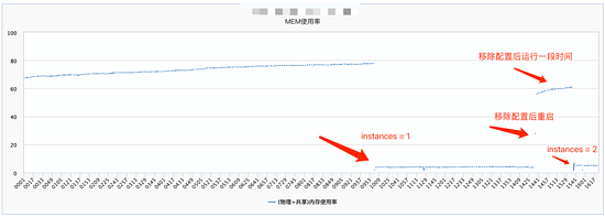 可见 worker process 数量影响了内存占用,原先内存使用率的趋势图上会持续增长(刚开始也是因此怀疑内存泄漏),这个问题在降低了 worker process 后并没有体现出来,目前暂且忽略,后续会持续观察。