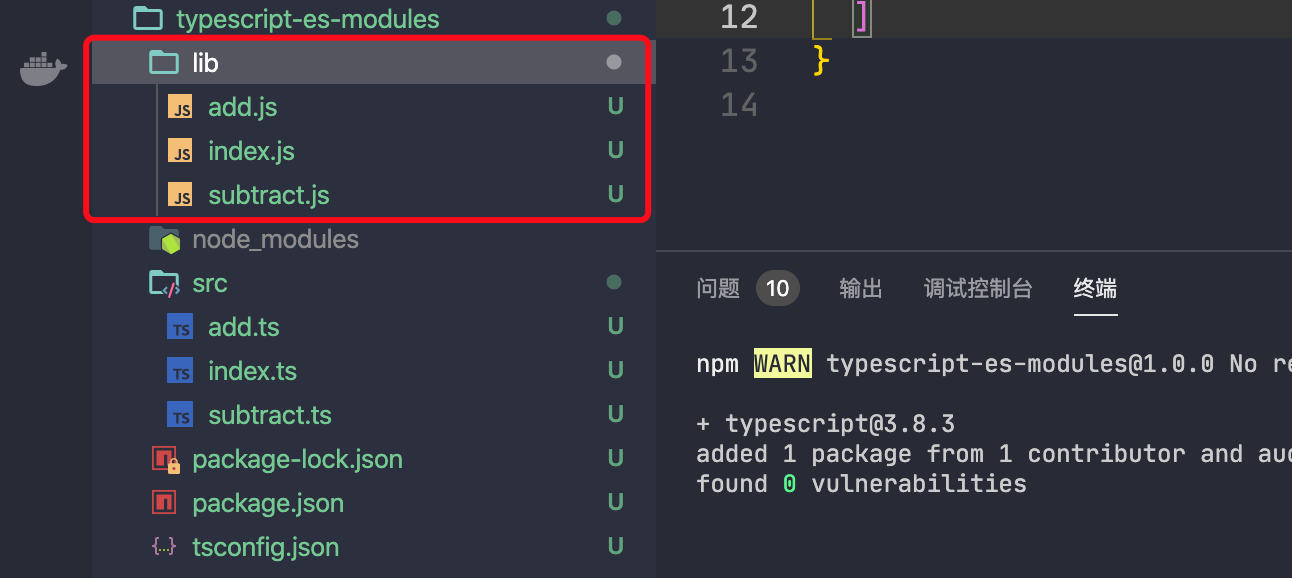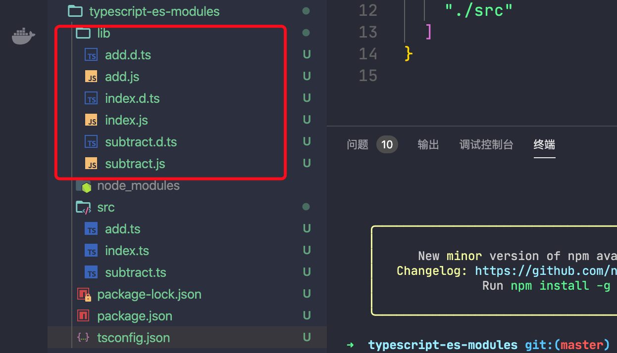 这个有点乱,让我们通过更新 tsconfig 中的 outdir 选项来将esm输出更新到 lib/esm 中