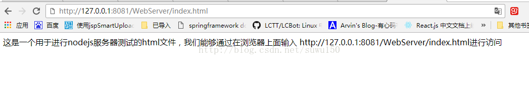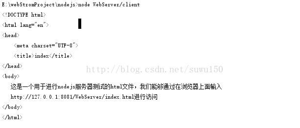 <!doctype html> <html lang="en"> <head> <meta charset="utf-8"> <title>index</title> </head> <body> 这是一个用于进行nodejs服务器测试的html文件,我们能够通过在浏览器上面输入 http://127.0.0.1:8081/webserver/index.html进行访问 </body> </html>