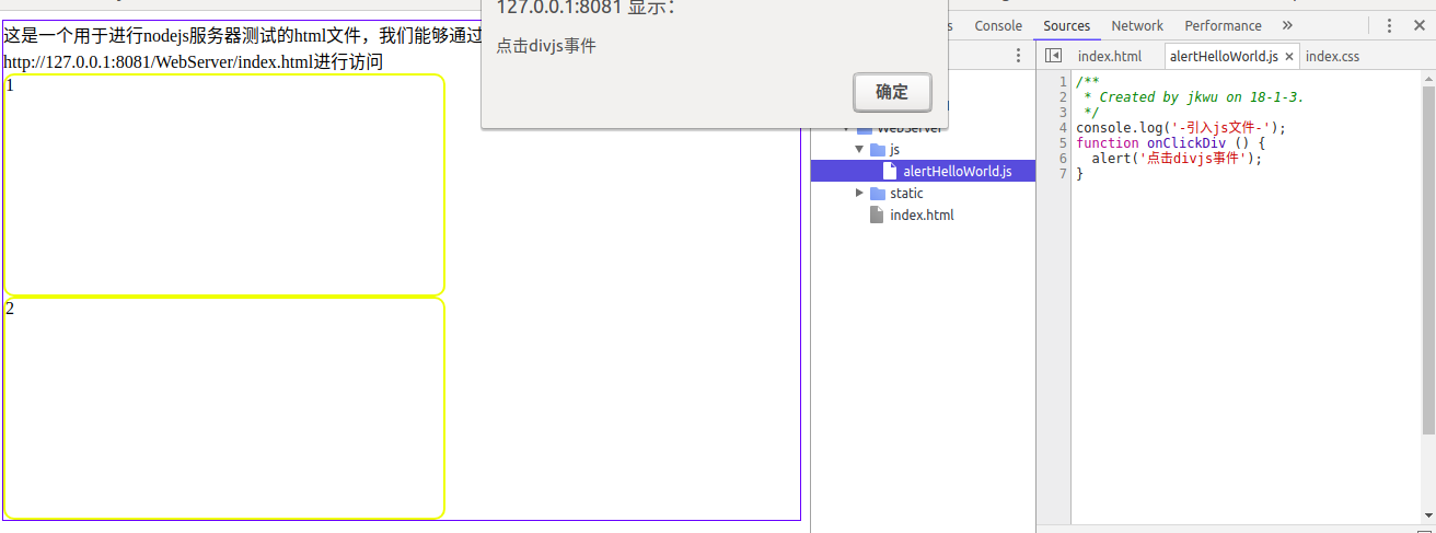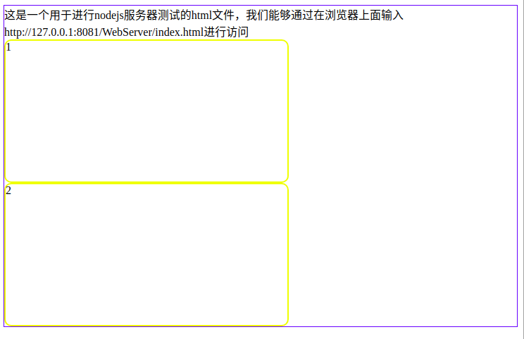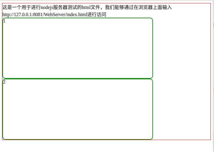 <!doctype html> <html lang="en"> <head> <meta charset="utf-8"> <title>index</title> <link rel="stylesheet" rel="external nofollow" > </head> <body> 这是一个用于进行nodejs服务器测试的html文件,我们能够通过在浏览器上面输入 http://127.0.0.1:8081/webserver/index.html进行访问 <div>1</div> <div>2</div> </body> </html>