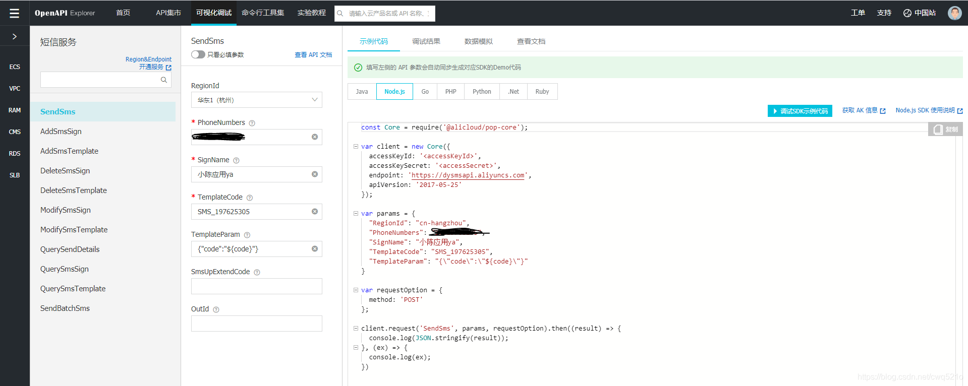 1. 进入短信控制台,对要发送的短信格式进行配置,如果没有签名,需要申请签名后操作