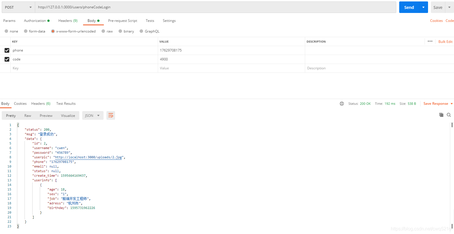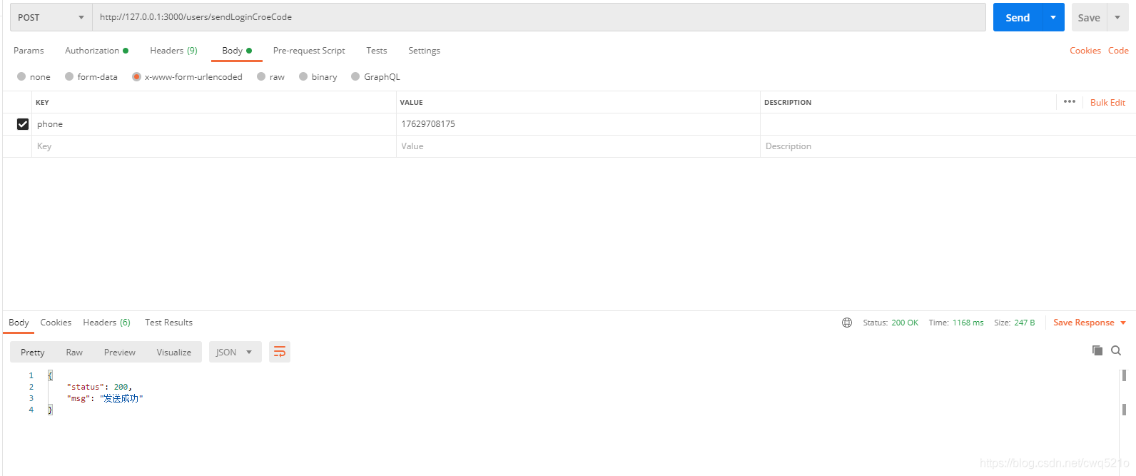 此处以postman 接口调试工具为例,手机号为数据库中注册过的手机号