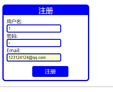 <!doctype html> <html> <head> <meta charset="utf-8"> <title>用户注册</title> <link rel="stylesheet"type="text/css" rel="external nofollow" /> </head> <body> <div class="form-container"> <p class="form-header">注册</p> <form method="post" > <label>用户名:</label> <input type="text" name="username"><br> <label>密码:</label> <input type="password" name="password"><br> <label>email:</label> <input type="email" name="email"><br> <input type="submit" value="注册"> </form> </div> <hr> <%=msg %> </body> </html>
