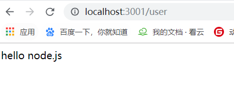 注:nodemon 命令需要全局安装 nodemon( npm install --global nodemon ), 在浏览器访问/user时如下,则说明开启成功