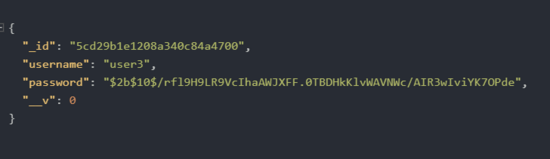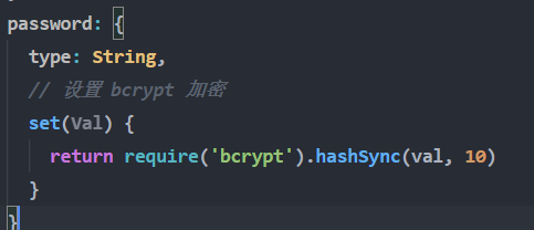 - 在 model.js 中设置密码入库前加密,这里的 hashsync方法接受两个参数,val 表示传入的 password,10表示加密的等级,等级越高,所需转化的时长越长