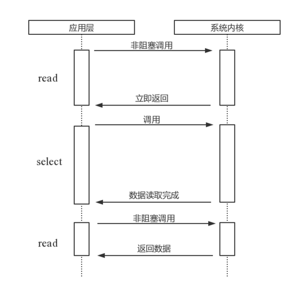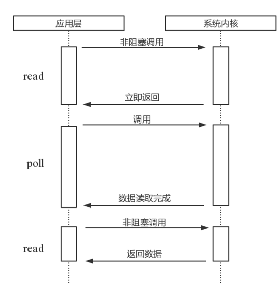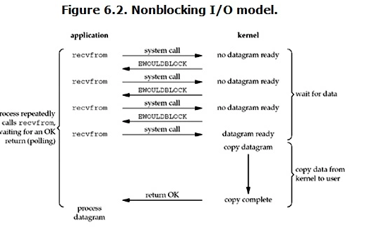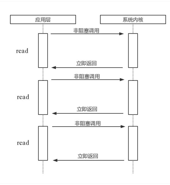 当用户进程发出read操作时,如果kernel中的数据还没有准备好,那么它并不会block用户进程,而是立刻返回一个error。从用户进程角度讲 ,它发起一个read操作后,并不需要等待,而是马上就得到了一个结果。用户进程判断结果是一个error时,它就知道数据还没有准备好,于是它可以再次发送read操作。一旦kernel中的数据准备好了,并且又再次收到了用户进程的system call,那么它马上就将数据拷贝到了用户内存,然后返回。