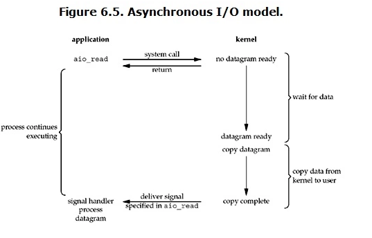 用户进程发起read操作之后,立刻就可以开始去做其它的事。而另一方面,从kernel的角度,当它受到一个asynchronous read之后,首先它会立刻返回,所以不会对用户进程产生任何block。然后,kernel会等待数据准备完成,然后将数据拷贝到用户内存,当这一切都完成之后,kernel会给用户进程发送一个signal,告诉它read操作完成了。