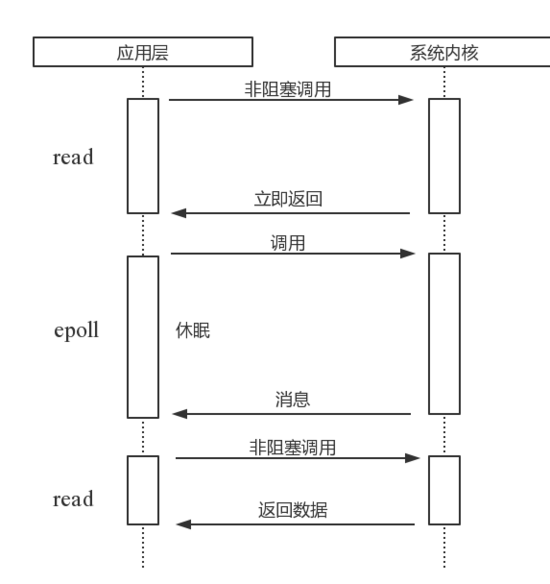 read。它是一种最原始、性能最低的一种,它会重复检查i/o的状态来完成数据的完整读取。在得到最终数据前,cpu一直耗用在i/o状态的重复检查上。图1是通过read进行轮询的示意图。