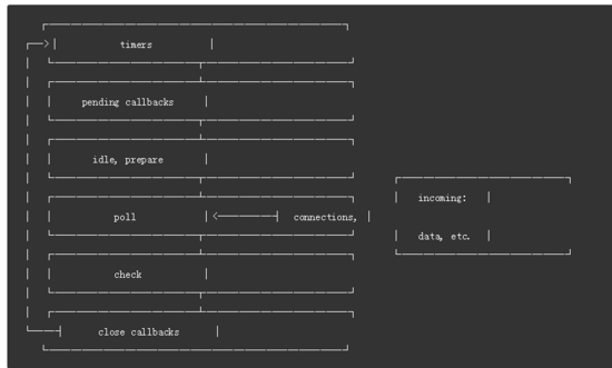- close callbacks: 执行close事件的callback,例如socket.on('close'[,fn])或者http.server.on('close, fn)。