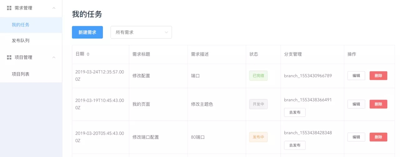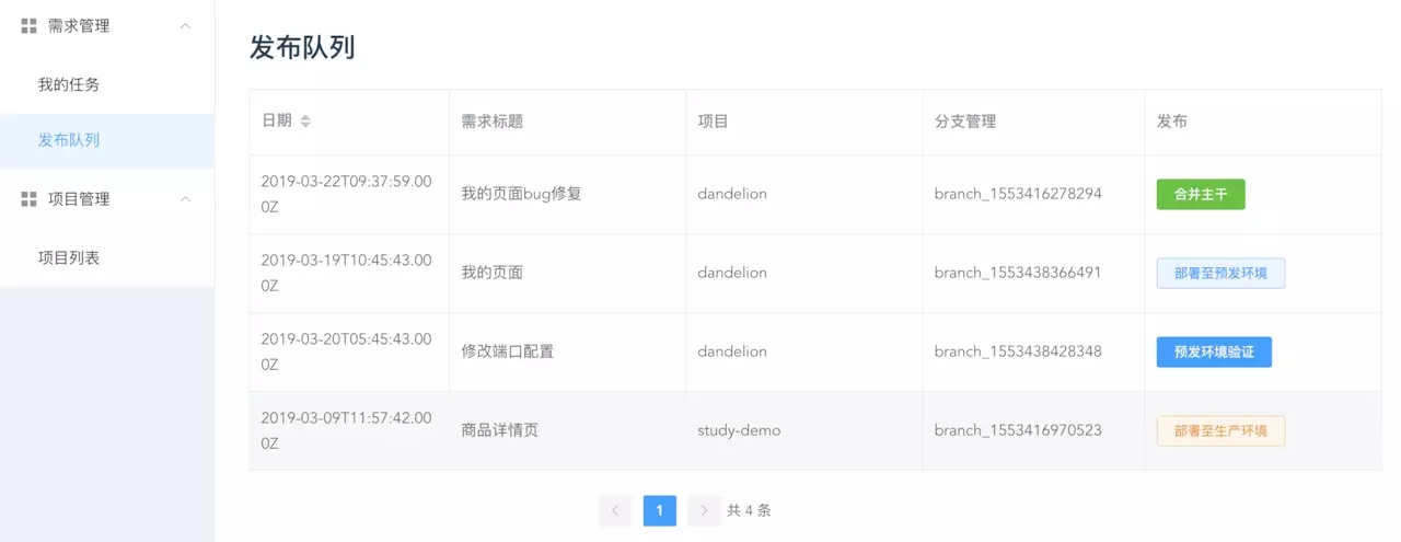 通过这个系统,可以创建需求、创建发布计划、创建分支、部署到测试环境、部署到生产环境、正式上线、合并代码等。