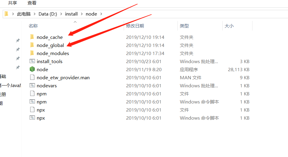 1,首先在d盘node的安装目录下配置创建两个文件如下图