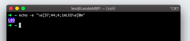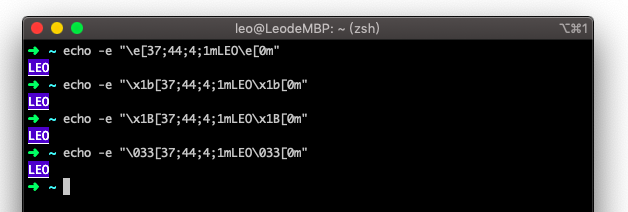 echo -e "\e[37;44;4;1mleo\e[0m" echo -e "\x1b[37;44;4;1mleo\x1b[0m" echo -e "\x1b[37;44;4;1mleo\x1b[0m" echo -e "\033[37;44;4;1mleo\033[0m"