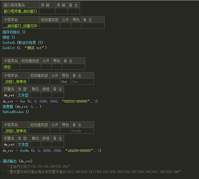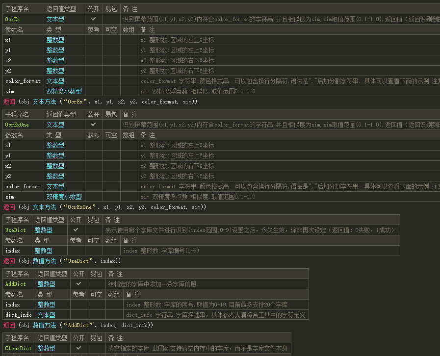 .子程序 OcrEx, 文本型, 公开, 识别屏幕范围(x1,y1,x2,y2)内符合color_format的字符串,并且相似度为sim,sim取值范围(0.1-1.0),返回值(返回识别到的字符串 格式如 "字符0$x0$y0|…|字符n$xn$yn")OcrEx不再像Ocr一样,支持换行分割了.