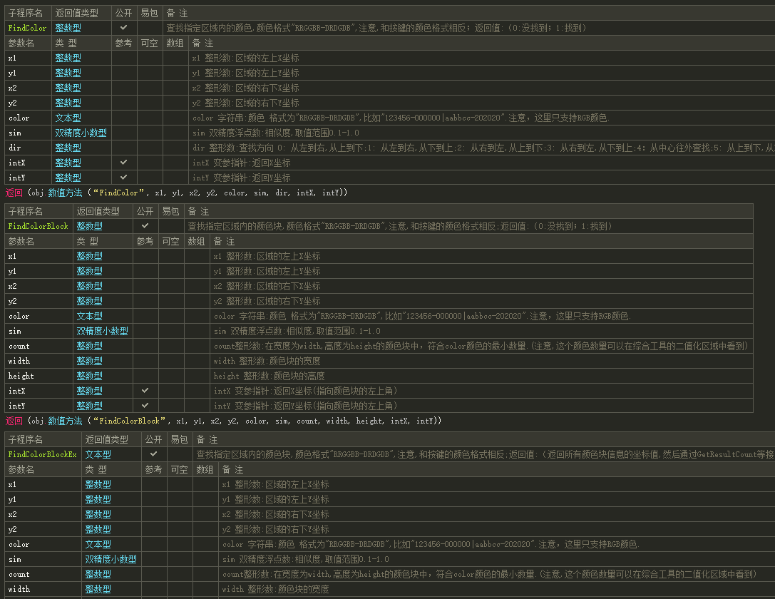 .子程序 FindColorBlock, 整数型, 公开, 查找指定区域内的颜色块,颜色格式"RRGGBB-DRDGDB",注意,和按键的颜色格式相反;返回值:(0:没找到;1:找到)