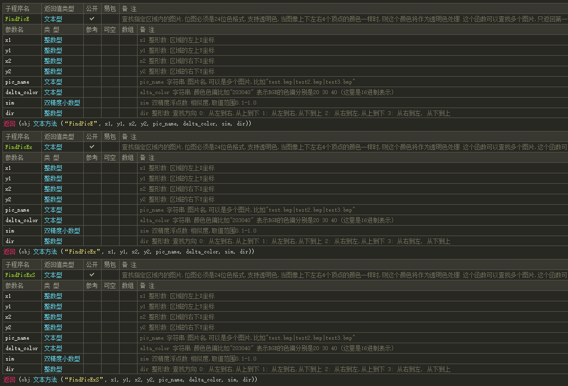 返回 (obj.文本方法 (“FindPicE”, x1, y1, x2, y2, pic_name, delta_color, sim, dir))