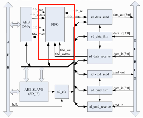 FIFO模块作为整个系统中的数据缓存模块,其设计为异步FIFO连接AHB clock domain 和 SD clock domain。SD卡读出的数据写入FIFO,DMA通过AHB总线的命令从FIFO中搬移数据到目标地址;总线上需要写入SD card的数据通过DMA搬移到FIFO,再通过数据控制模块的控制将FIFO中的数据写入SD card。