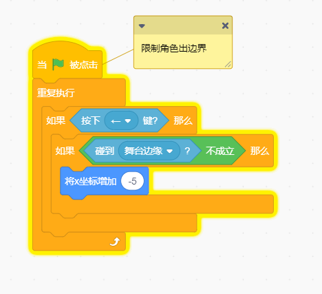 代码解释:需要用到两个如果语句,一个如果语句是关于键盘←键的,另一个如果语句是碰到舞台边缘球拍停止,再在外面嵌套一个重复执行语句,每触碰一次键盘←键,球拍向左运动5个像素单位。