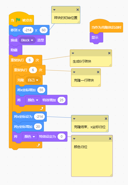 生成一个6行6列的砖块,具体代码解释如图所示。