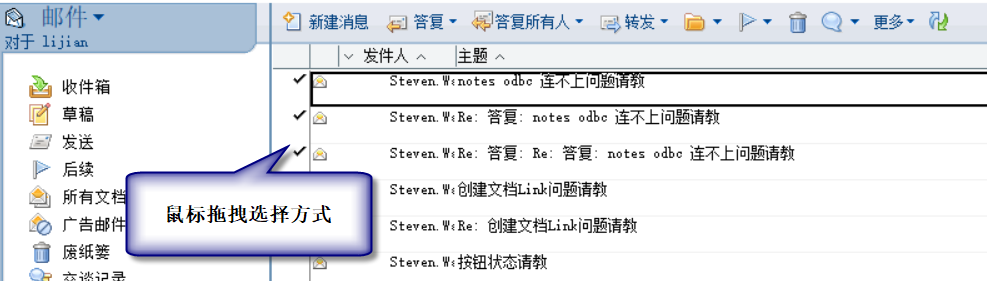 三知搜到不少关于过去的Notes辉煌,比如在古老的R7以前时代,我们是可以通过鼠标拖拽的方式来选择多封邮件的。